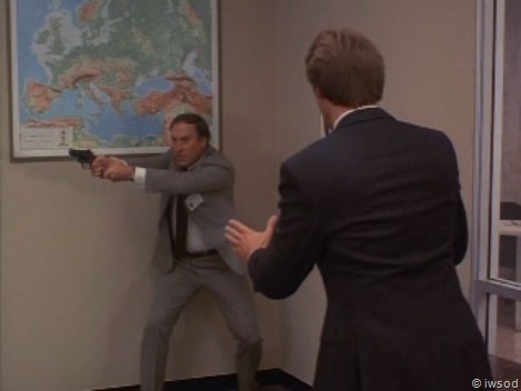 The reason I jump in here is that I really like the opening scene. I love how Lee tries to stop Walt, hoping that he will be unable to shoot a friend. I always wonder if any man could really dive to the ground fast enough to avoid a bullet shot at such a close distance, but ohhhhh well… I go with it. Especially since we see super-resolved Lee flying through the glass pane, wow. He doesn’t care whether he might hurt himself. It looks pretty realistic how both men smash against the wall and Lee hurts his knee badly… He really seems to be in pain. Nonetheless he tries fiercely to scramble on his feet, shouting „Don’t shoot!“ like a madman to the alarmed security staff… All to help a friend who is in serious trouble. What a man! Don’t you think this is very brave and altruistic? I think it is one of my favourite „Lee-Stetson-super-hero“-scenes. Ahem. Alright, I’ll stop raving now.