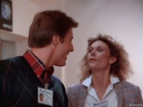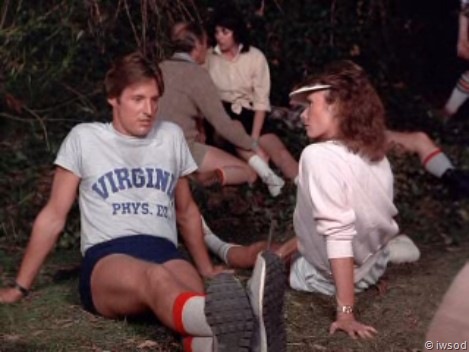 I also LOVE the workout conversation. Lee goes on about his elaborate and complicated fitness routine and then she comes back with “Fitness with Dave”! It makes me laugh every time. Lee is trying too hard in this episode— the golf course, and now bragging about his over the top exercise plan. . . . And then Amanda comes along and accomplishes things without even trying very hard. She got the invite to the retreat, she got fit with Dave and didn’t need to run through the Alps . . . In these early episodes the writers seemed to work pretty hard to extend a theme through the entire 45 minutes. Love it.