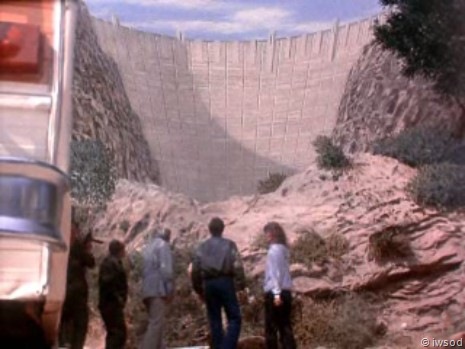 We see the vigilant pull up in front of a huge fake looking dam- Lee, Amanda and the baddies get out.. 118