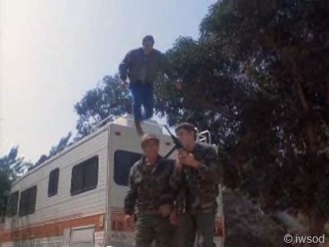 Ok, Lee gets on top of the vigilant ( what no automatic roof protection either?) and he looks 126mighty fine as he lines up the baddies in preparation for his big jump.. determined Lee.. swoon.. Lee the human fly .. I love pics of Lee in mid flight.. so funny!