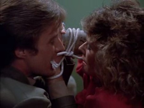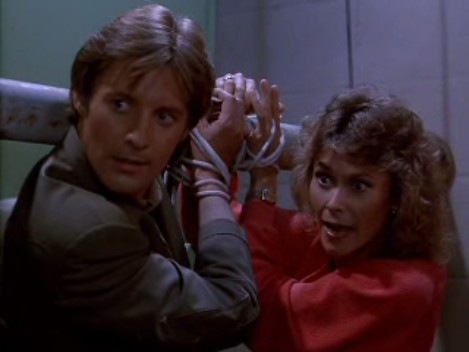 Haha, don’t you think the writers wanted to present us something as close as possible to a near miss kiss? Lee and Amanda tied up like this, trying to loose the knots with their teeth… Did you realize the sign on the door says „High voltage“? You can see it when Alexi closes the door. Wohooooooo!