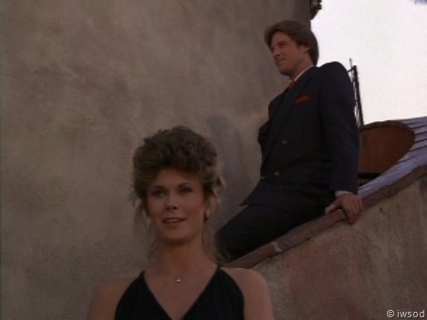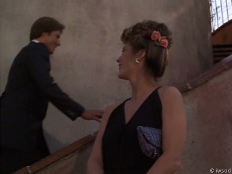 Here, Lee is on the steps above Amanda, who is wearing a dress designed to get his attention. In the “Sudden Death” episode, Lee mutters the same two words while he leans out the window to kiss her.