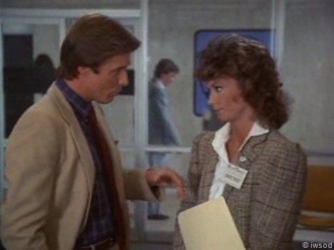 Suddenly a white sedan comes tearing into the parking lot nearly taking out friendly Scotty (is he named after the director of this episode? Oz Scott?!)