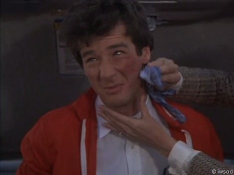 don’t you just love how Amanda dabs at his sore cheek and fusses over him ( a lot like she did with Lee last week and his poor Jaw. only this time it is Scotty’s poor cheek!) Can Scotty describe them? Sure!! Scotty can describe them down to their wing-tipped oxfords- he says he has an eye for details, shame he didn’t have that eye for detail when they first came back posing as insurance inspectors!