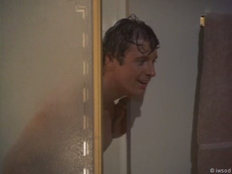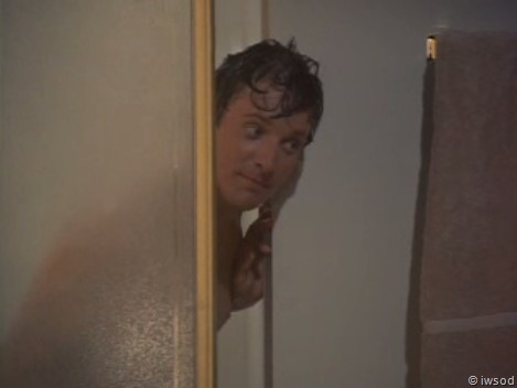We see Lee’s silhouette turn towards the door in the shower, interrupting his furious dedication to the cleanliness of his armpits ( yet again!) but he seems to be in no hurry at all.. Interesting.. he doesn’t seem to care that Amanda opened the door! haaaa..