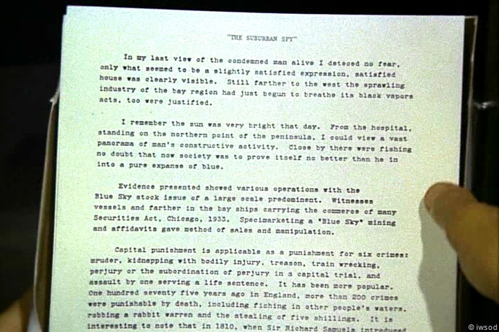 all about capital punishment.. and blue sky mining! LOL! (I was hoping it would tell us something about operation sandstorm! )the heading ‘ The Suburban Spy’ fits.. but the rest of it is weird – and as he flips through the pages you can see – every single one of those pages says exactly the same thing! Rofl!!! now that really isn’t a good deal! tee heeee!! Ahh these small ridiculous things amuse me!