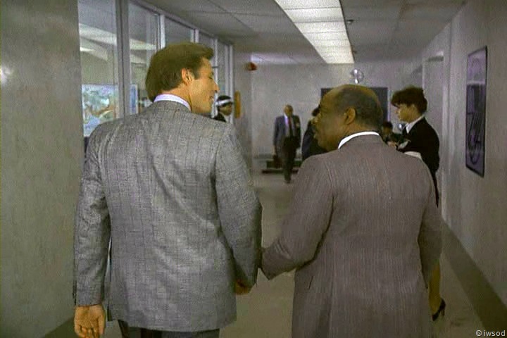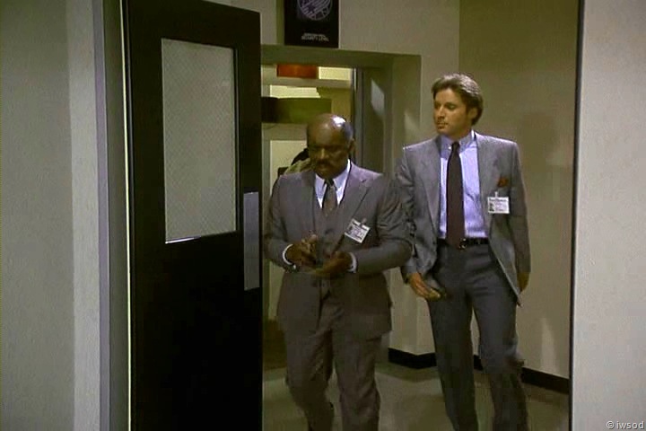 2.06 BRUNETTES ARE IN.avi_000390190On to the agency, exiting the elevator are Billy and Lee – the doors sound very clunky!!! Lee is being a good employee and respecting his boss… err well no- actually Lee is arguing with Billy about Amanda. And so commences a big theme in this episode -IMHO– Lee and his lack of acknowledgement of Amanda and her abilities..