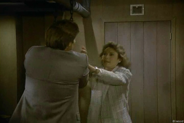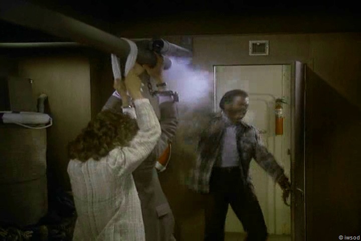 Lee tries to find keys to his manacles but there too many keys to try so he keeps them on.. as they look for a radio Lee wonders where Sinclair is ( did Lee see Sinclair? How does he know Sinclair is involved? Maybe he saw him lead Amanda away at the mansion.. Hmm..) Anyway, they get sprung by Kurtz and an axe! argh!! Lee and Amanda split up, Amanda heads to the CB radio to call the agency and Lee fights Kurtz…Lee throws everything he can at Kurtz and that axe- lots of yellow flowers died in the making of this scene! Winking smile