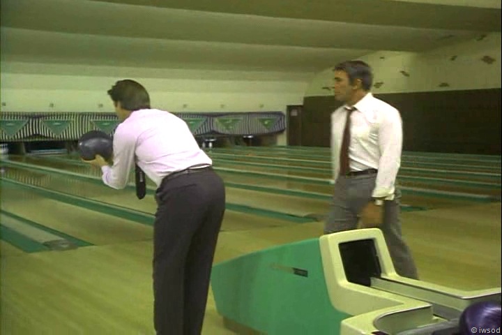 First of all, love the look of Lee’s backside. Secondly, these spies always seem to be just a bit out of touch with reality. Who goes to a bowling alley in a dress shirt and tie? Lee and his contact are so obviously out of place.