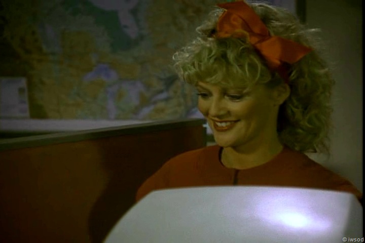 What’s with the hair bow? Trop Mignon! 😉 She looks about 10 years old! ha! The nail polish and remover on her desk looks a bit random: there is a part in the script where they have her paint her nails while making Sykes wait while he thinks she is looking up his account – but it was cut.. so now it just looks like she always keeps nail polish on her desk.. soooo professional! Not.. I would have thought Francine would keep things more professional than that.. oh well. She has a sweet French accent!