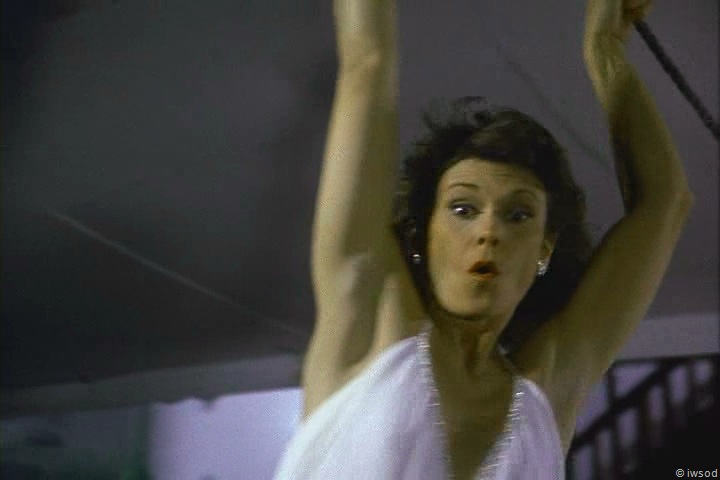 Soooo.. the swingy thing swings out.. and she’s dangling and squirming and clinging for life – right through the whole commercial break from the looks of it! Winking smile good thing she’s got great toned arms! Smile