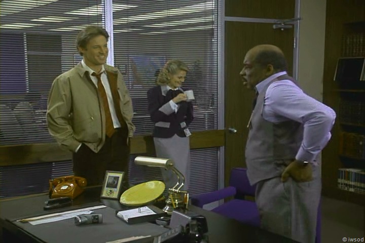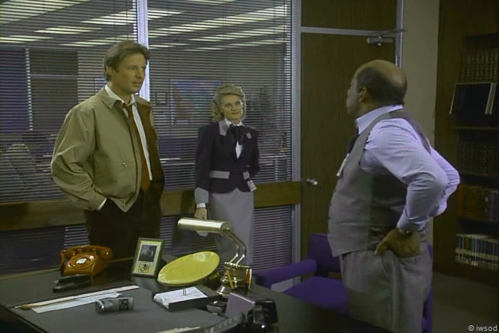 Funny catch with the portable shaver (i.e. electric razor)! I love it. That has no reasonable explanation to be on the desk except that it was late in the day and Mel (or Bruce?) needed to do a quick spiffying up before the cameras rolled! I do occasionally notice morning scenes with a scruffy look to them and figure that must have actually been a pretty long day on the set. (Hmm, although give that this scene was right after the botched second defection attempt, some extra stubble would have been very appropriate for the scene. Still, I’m betting you’re right about it being MS’s!)