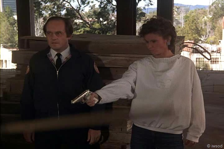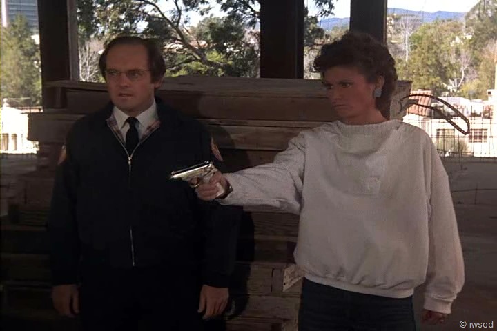 I see when Karen’s gun goes flying she raises her arm and you can see under her top – she’s wearing some kind of a harness! LOL.. must have been for the hanging scene that’s coming..