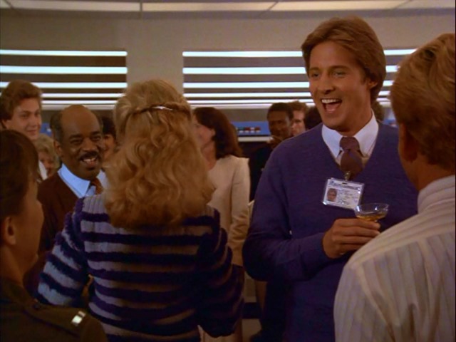 (Note: the overly brown colouration of Holt’s tie is caused by red lighting; the suit that Fremont—standing beside Holt—is wearing is actually grey, not brown.)