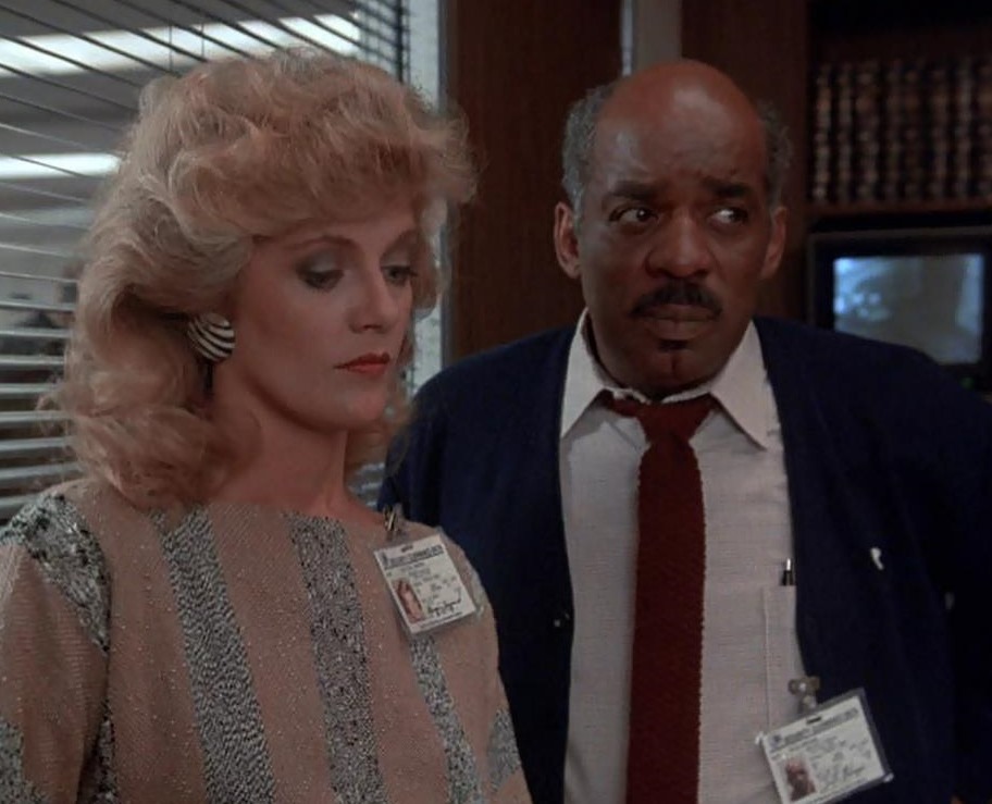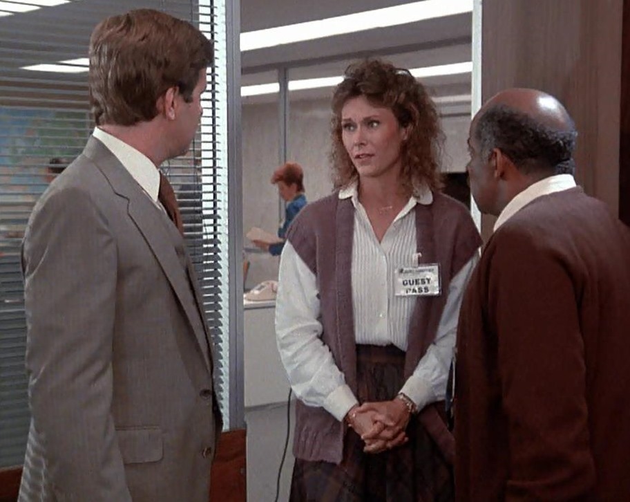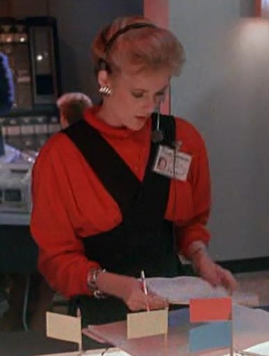 Oh gosh – zebra striped earrings and animal print stripes on the shirt? Oh puhlease!!! Give me Amanda’s winged shirts and her plain brass ear buttons anyday. Sorry animal print lovers! That red and black get-up on Francine is one of the worst. It looks like it’s trying to squeeze her you know whats out to the side. Is it on backwards? I think we’ve discussed on the episode post how it looks like a Guinan (Whoopi Goldberg) outfit from one of those Star Trek series? All that’s missing is the wacky hat. I never noticed it was worn in TFT with a different blouse. What a catch!