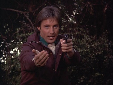 Ahhh, Lee in the outdoors, with a gun, hands up where we can see them, telling the baddies what to do….  Open-mouthed smile
