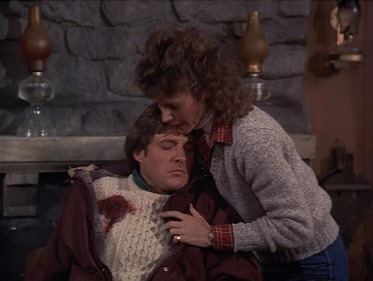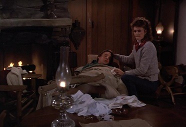 Lee’s just been shot and makes it safely back to the cabin.  Amanda’s all over him in this scene.   Two hands here.