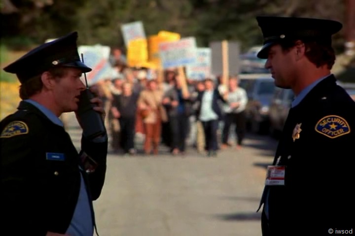 The security guards see the group approaching and call to their boss, Crawford, for instructions..