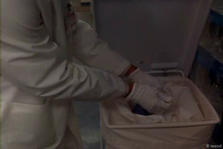 Back in the lab and Oompa Fletcher exits the secure room where the crystals are kept. All the other staff are still distracted at the windows, so Fletcher is able to easily open the laundry hamper and slip the crystals into a lab coat pocket. [Too funny, you’d think he would have had them in his coat pocket and changed coats to