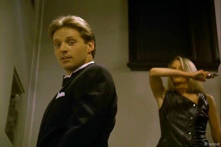 For a bad guy — he’s pretty harsh — not only does he stab his business partner in cold blood in front of us! he has magic skills — he able to hold the steak knife with just enough force to stab poor Byron “He’s a Great Guy” Jordan but not too tight to smear Amanda’s fingerprints from the handle. Now that’s the hallmark of a real pro!![]()