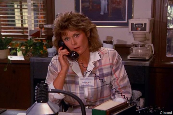 We cut back to Amanda arriving at the Q bureau – hmm does she have her own key?! Amanda seems to be sneaking and being quiet.. lol.. She walks over and sits at Lee’s desk and picks up a piece of paper that was laying there to read it. Okay, not a fan of the top.. but anything is better than the earlier nurses tunic!