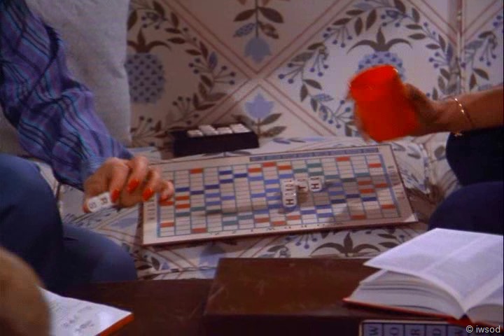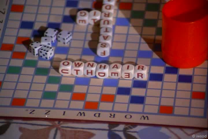 We see a close up on the board.. (btw- this close up doesn’t match what we saw when the scene first opened!) why are there five die on the board?! hmm seems this isn’t scrabble.. it’s ‘WORDWIZZ’ ??(not wordwizard?!) Is that game for real?? and the different coloured squares have no words in them- is this a scrabble rip off? can someone fill me in? *triple points!*]