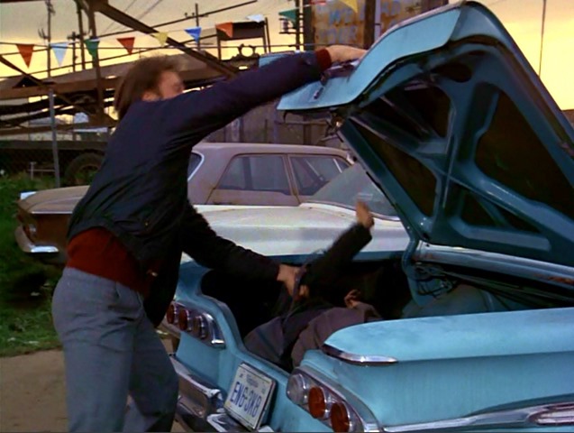 I didn’t notice any real Washington DC/Virginia/Maryland/etc. plates in these episodes but, again, we have multiple instances of (real) California license plates on nearby vehicles. A couple of the more prominent/interesting instances occur in Lost And Found. In one of the scenes where Amanda and Angelo are being driven around in the blue Agency van, a white Chevrolet coupe can be seen stopping at the traffic light; the car has an old (yellow on black) California plate. Then, while Lee is driving Eva to Liberty Larry’s in his Porsche, a dark blue Chevrolet with white and red trim can be seen passing, with a California license plate visible through Lee’s grubby driver’s side window. clip_image001 Neither of the plates are legible, but are readily identifiable as Californian. (First pic cropped for clarity.)