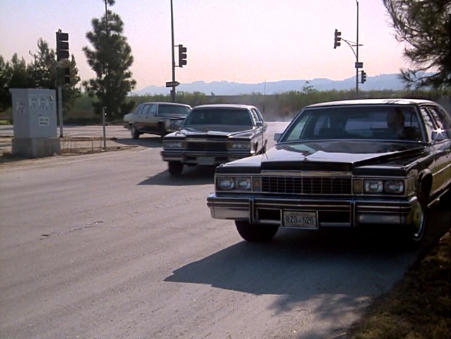 Note: the four Agency limos used in Dead Ringer are very similar (or, at least, two of them are similar but definitely different, however the other two weren’t seen close enough to confirm)—they’re also Cadillac Fleetwoods, but lack the red striping and the front grille is different (–> different year; Agency limos on left, baddie Polo’s limo on right):