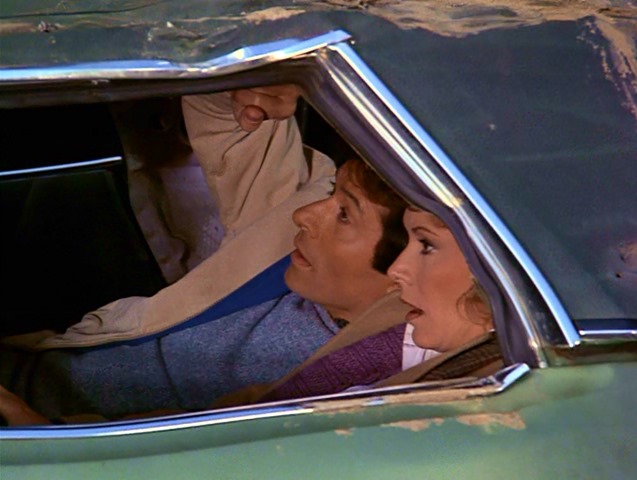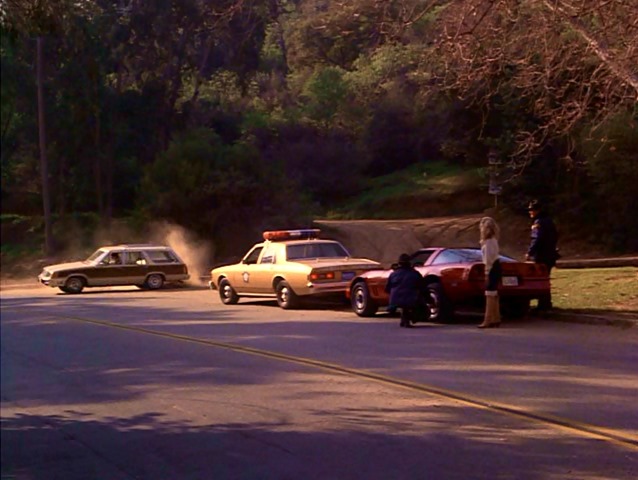 In TM, Amanda wants to get the attention of the sheriffs in order to save Lee from baddie Agent (Mole) Benson, but they’re engrossed in changing the tyre for the helpless (?) blonde Corvette driver… so Amanda returns and whips the station wagon into a 180° in front of them. “Let’s go, let’s go!”