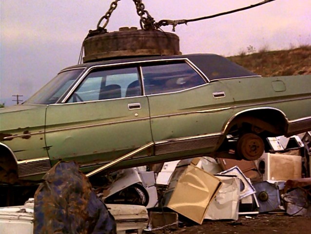 (I can’t see enough of the car to determine whether this an earlier-year Ford LTD or whether it’s a completely different make and/or model—but it’s clearly not the previous car.) Moving on, we see the first car being swung around on the magnet chains—loose trim and rust clearly visible, but sans rear pillar emblem—then, we see the third car: