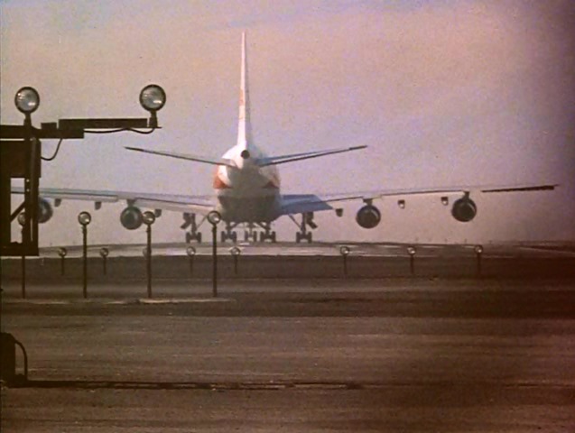 —we see some mismatched plane footage… The plane the action is centred around (a 1962 Boeing 720-047B) has thin orange-ish stripes above a brown stripe on the body and the top of the tail, but the stock footage tailshot—after Polo faints—shows a plane at the end of the runway with a red logo/stripes on the middle of the tail and red stripes on the body. Also, the number of sets of wheels changes—three sets on the orange/brown-striped action plane, but five sets on the red-striped stock footage plane:
