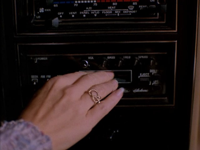 In SD, Amanda’s jewelry (and fingernails) magically change when she puts the audio tape into the car stereo…
