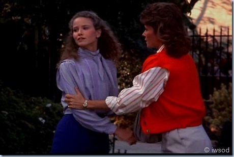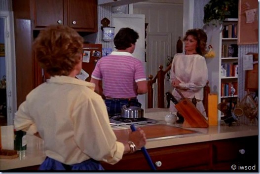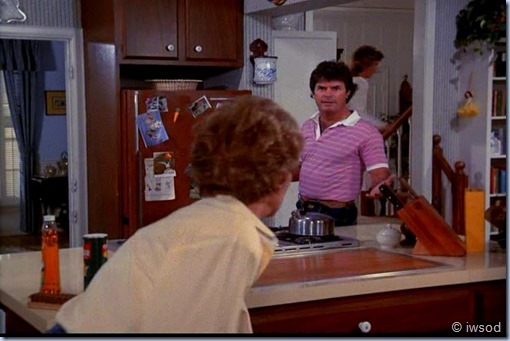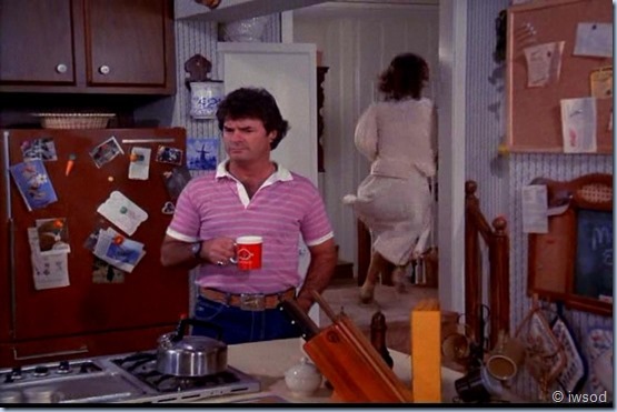 Oh no! The madness is spreading – Dotty’s dressing down now as well! Oversized blouse and shapeless skirt is not a good look on her. So we have Amanda’s gruesome outfit made more gruesome by a red wine soaking, dowdy Dotty, and Buck in a pink shirt – all packaged up in one heinous fashion crime scene! 😯