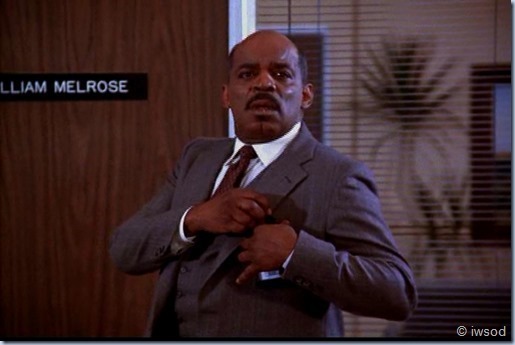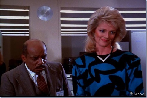 Combine that dialog with the big hair, the eye-wateringly awful abstract pattern dress, pointy necklace, mountainous shoulder pads and a particularly heavy application of blusher this morning, and Francine wins the Worst of the Worst of the 80’s competition today.