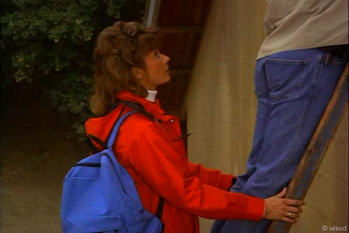“As Lee and Amanda approach, he shoves a painter’s ladder against the building and climbs up to an air vent. Lee fiddles with the vent screen, but can’t get it off until Amanda takes off her backpack, extracts a Swiss army knife. He works the screen off, then climbs inside.”