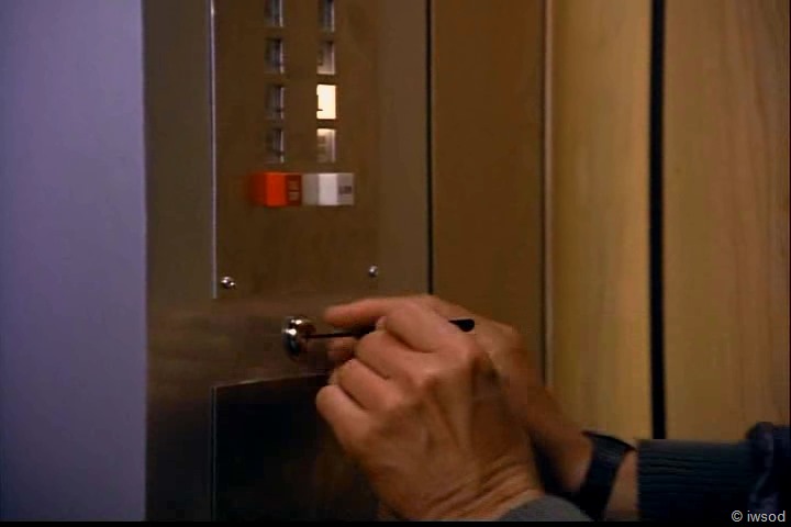 Amanda nods, her face flushed with excitement. Lee releases the STOP button, manipulates the pick and the elevator starts upwards.