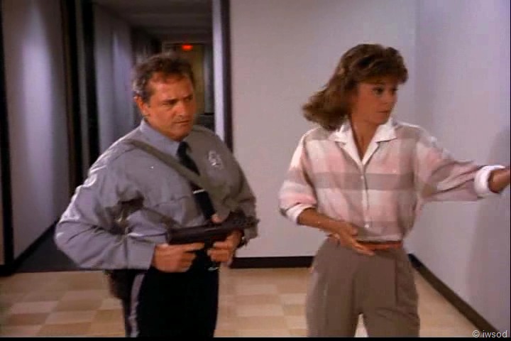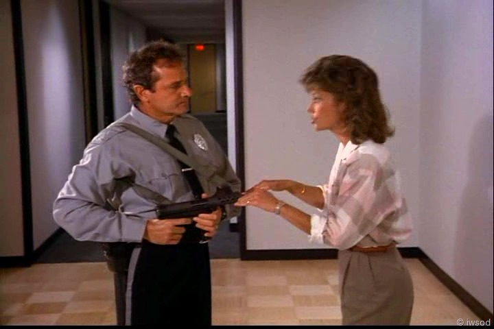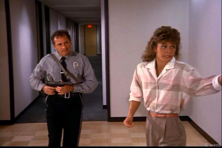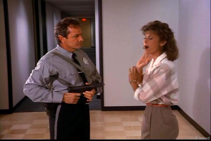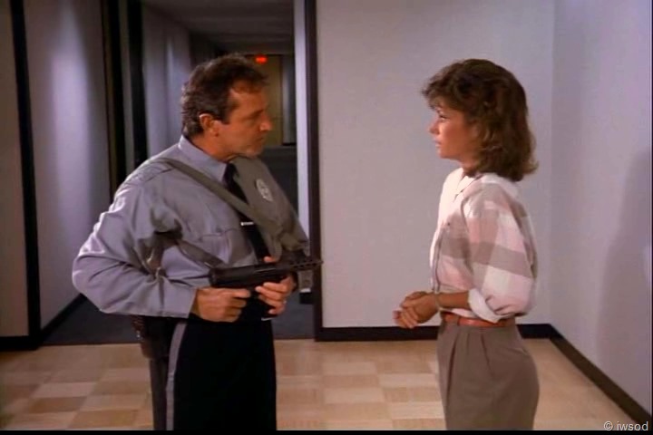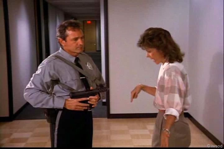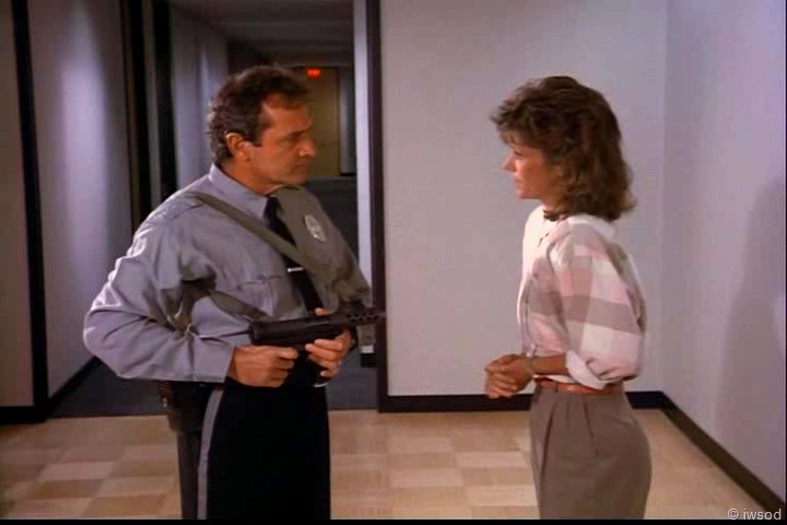 To me it’s always seemed weird that Amanda gets out of the elevator to be confronted by a guard carrying a serious machine gun (more specifically what appears to be a Tecuzi-9 submachine gun) and doesn’t blink an eyelid. Instead she just seems to treat this as normal and launches into her cover story. Surely a civilian getting out of a lift in a commercial or commercial/residential building would at least initially be taken aback by being confronted with a machine gun toting guard?? And he’s got the gun pointed at her the whole time! Yikes! 😯 Looks like the sort of gun that could shoot 30 Amandas a second!
