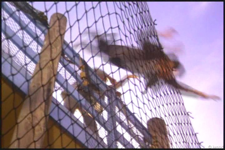 I think the scarecrow-looking thing is an old diving suit. And for some reason I think that Lanz actually hit the hand of the diving suit, which in turn hit Lee in the nose. Maybe I’m wrong, I need to look at it again though.