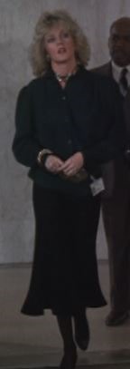 And finally, in black and looking very professional and not a bit ridiculous (from Burn Out) – bottle green top with flare at the bottom black skirt (not wild about jewellery).