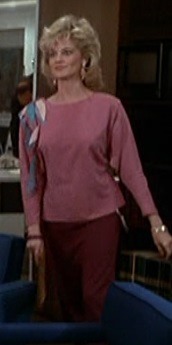 …if it weren’t for that strange clip/ pin/ brooch/ ornament (thanks to KC for this last suggestion) on her left shoulder. (Is it a not-so-hidden instrument of torture?)      S1E17_good_blue_Francine_strange_brooch The blue and black look good; the shoulder pads are built in and very discreet. Even Francine looks surprised, in a defensive kind of way.