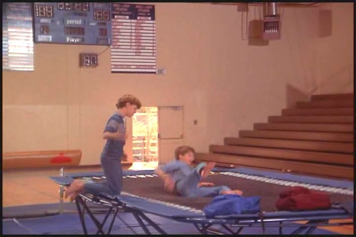 The former teacher (and current mom) in me is freaking out that the two boys were allowed to play on a trampoline unsupervised. Can we say neck/back injury/lawsuit waiting to happen. That school is pretty lax even for the 80s. I wonder if there is also a shooting range they kids could hang out in without any adults around to ruin their fun.