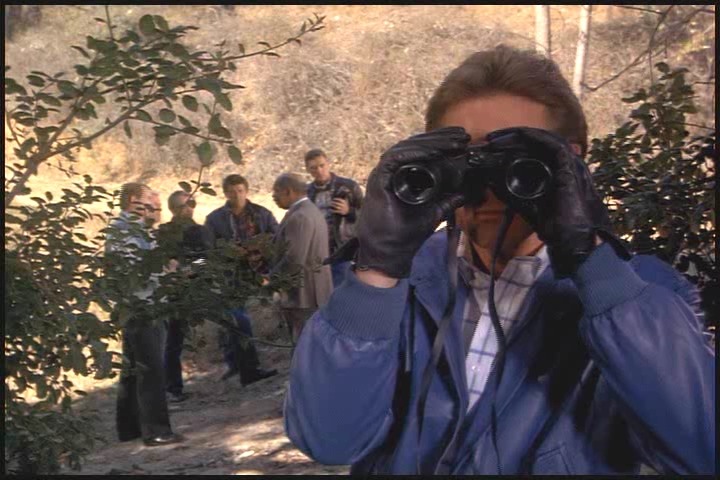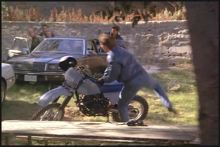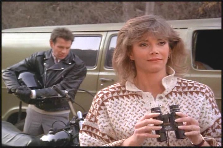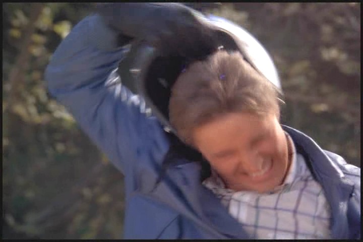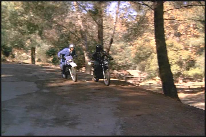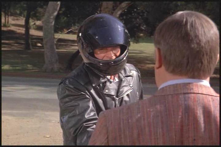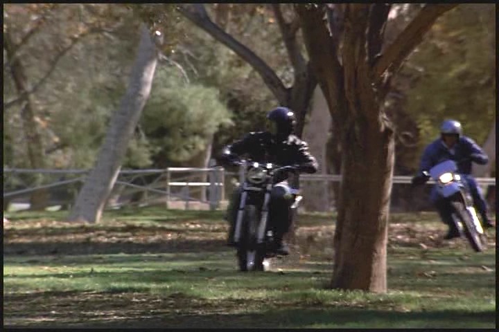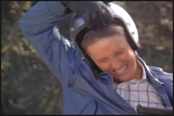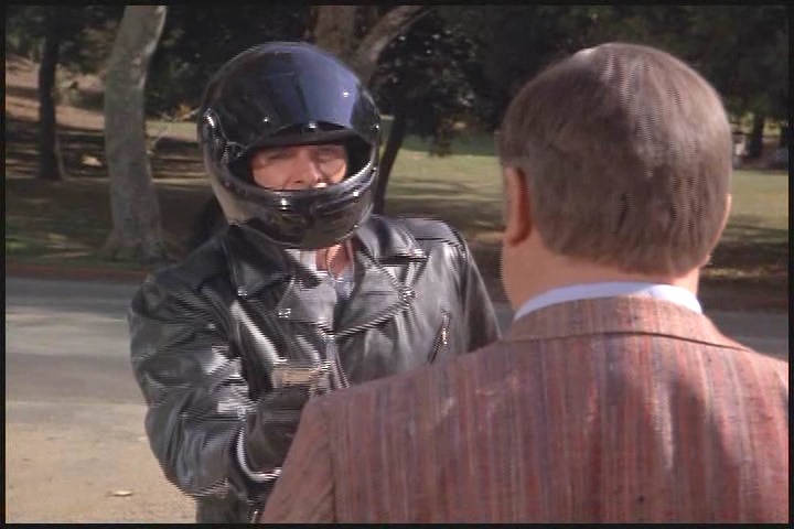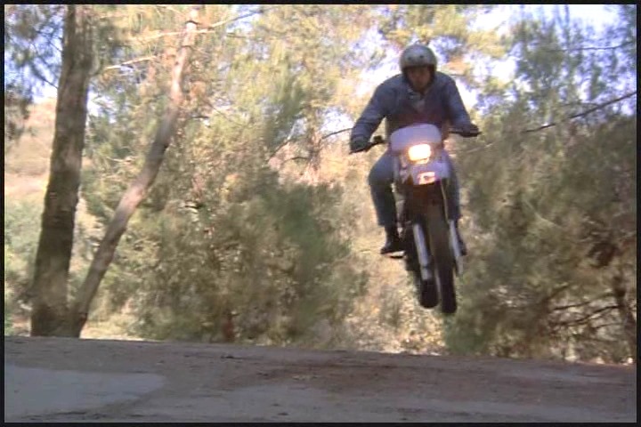 As Lee told Amanda earlier he’s had a lot of field experience, so just like a boy scout he’s always prepared. Cheesy leather jacket, check…miraculously appearing leather gloves, check…ridiculously large binoculars, check…matching, just-in-case motorcycle, check…stuntman transition helmet, check…requisite chase scene, check….and action!