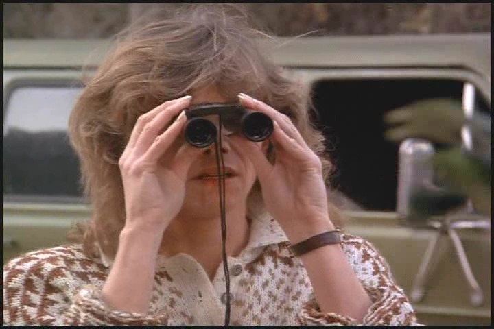The shot cuts to Carla, standing near the van and looking through binoculars. She takes a deep breath and watches on as this colossal mess unfolds..