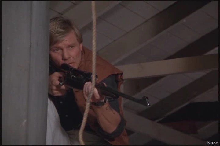 As Lee calls out we see Scorpion Dude moving into position in the barn with his rifle.