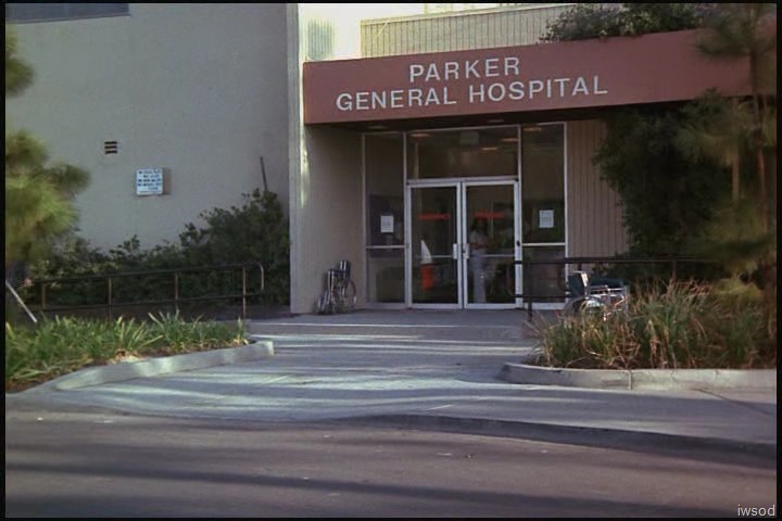 We cut again to an exterior shot of Parker General hospital. Lol this time they’ve reused the very first shot we saw of the hospital.. same nurse in the doorway.. and they’re always leaving around those two wheelchairs! Such waste!