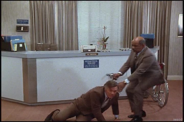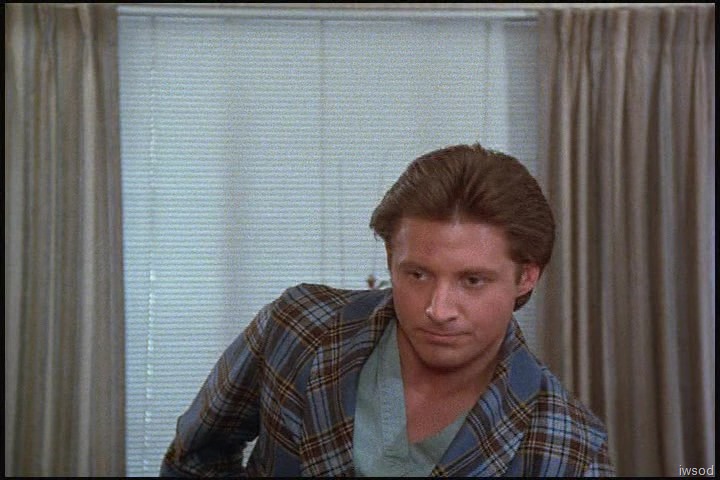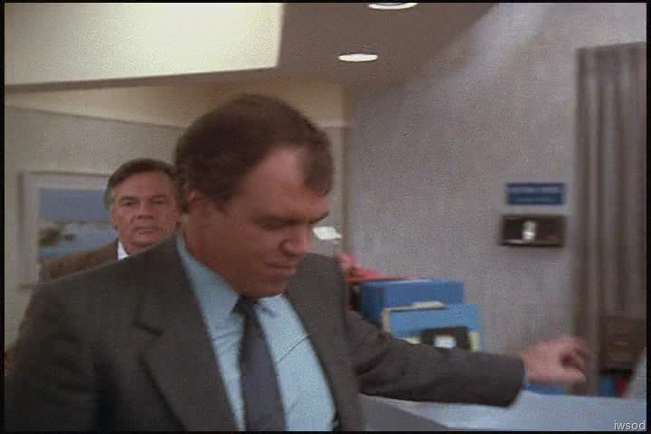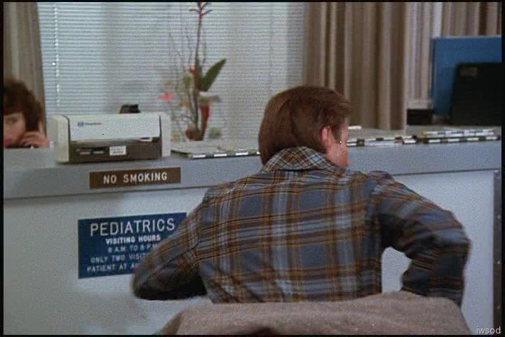 Gosh, that hospital wallpaper is hideous. And I think it’s funny that they are apparently in the Pediatrics section of the hospital? Where are the kids? The families? It says Pediatrics Visiting Hours on the plaque on the nurses’ station right where Lee gets up from his chair. That seems a bit odd. Or maybe this is the general waiting area and the sign is special for peds?