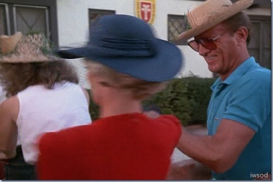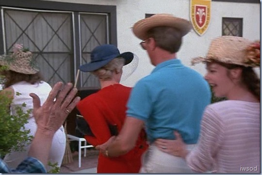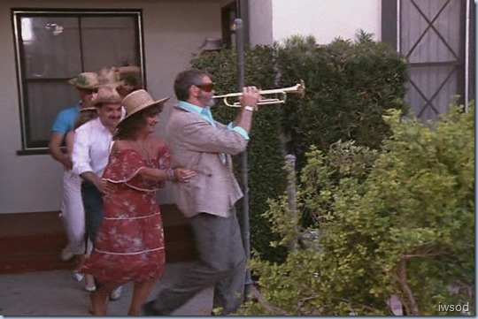: As I said, Ma’am, that is the Cap D’Far Embassy – (Next thing we see King Trumpet at the head of a congo line making his way out to the pool area as Crowley continues)