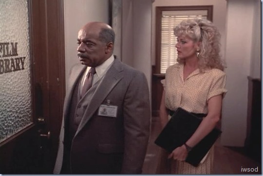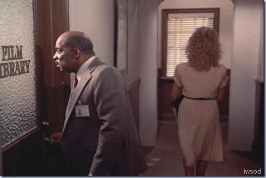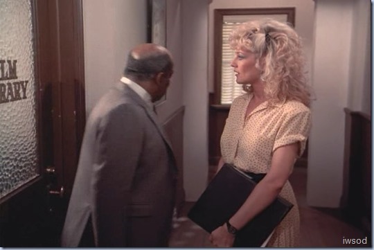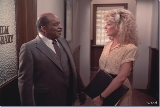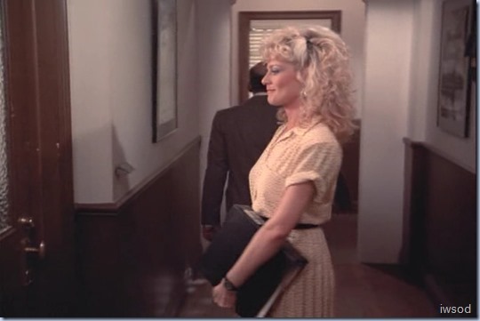 Ah Francine: now see, she barely gets a look-in in the original script but gets a nice long grin at the locked door in the final version. Even back in the day, I interpreted this the same way: that she knows perfectly well why that door is locked and her smile is both amusement and “just what I thought!” and significantly, she walks away and leaves them alone. For the past couple of episodes she has maintained the same sarcasm levels she always has, but for most of this season, there’s been no real malice behind any of her comments. In fact, interestingly, her jokes have all been about their relationship and there has been almost no comment from her on Amanda’s work. The last good work zinger was in Reach for the Sky: