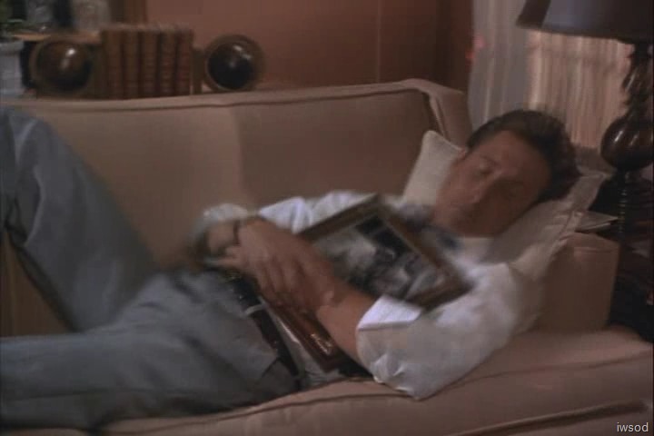 He turns and picks up the large framed black and white photo behind him. Looks like it’s his folks? I see the frame (and photo) has gotten an upgrade from the season 3 photo by his bed. LOL. Okay maybe that one is still there Winking smile it is after all his cover family photo!