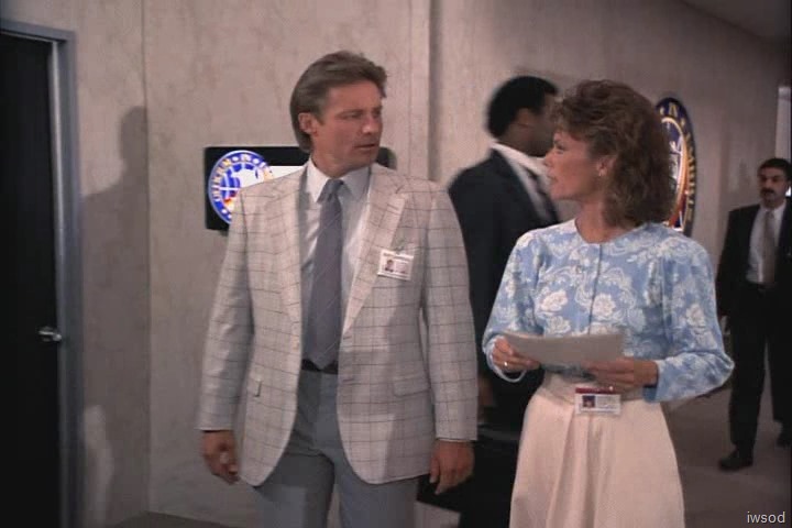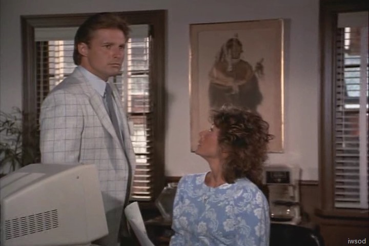 Oooh! A new top for Amanda. I like the change. The shoulder pads don’t look enormous and it is flattering on her because it is not super blousy like so many of her tops. I do not care for it paired with this skirt though.